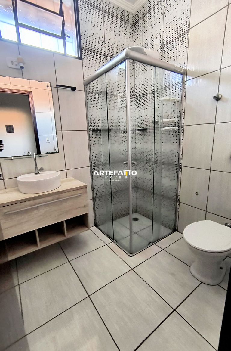 Banheiro social equipado com gabinete e box de vidro