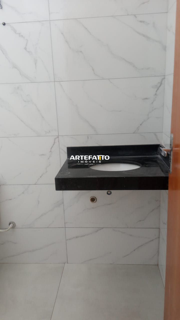 Acabamento com porcelanato, blindex, sanca e pias em pedra São Gabriel.