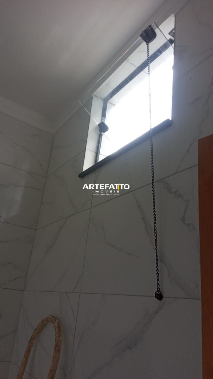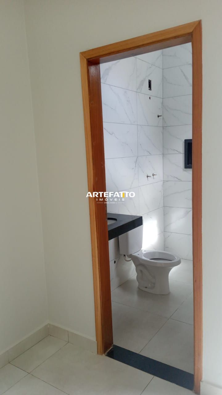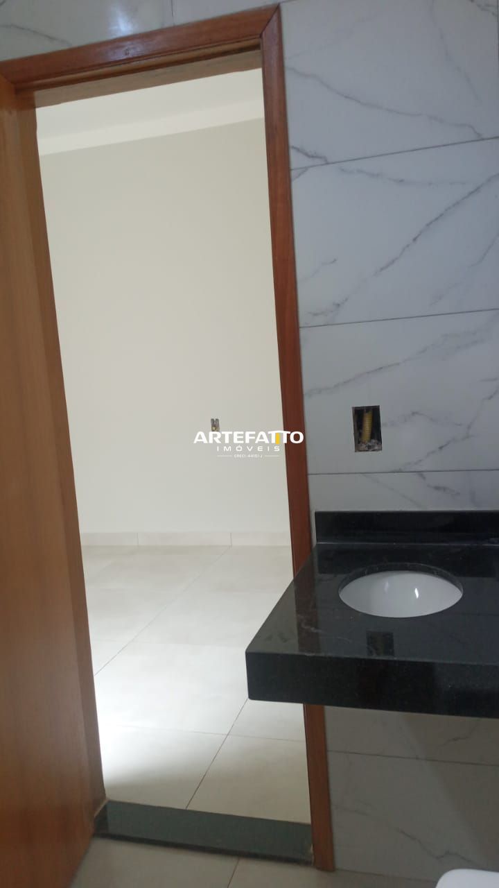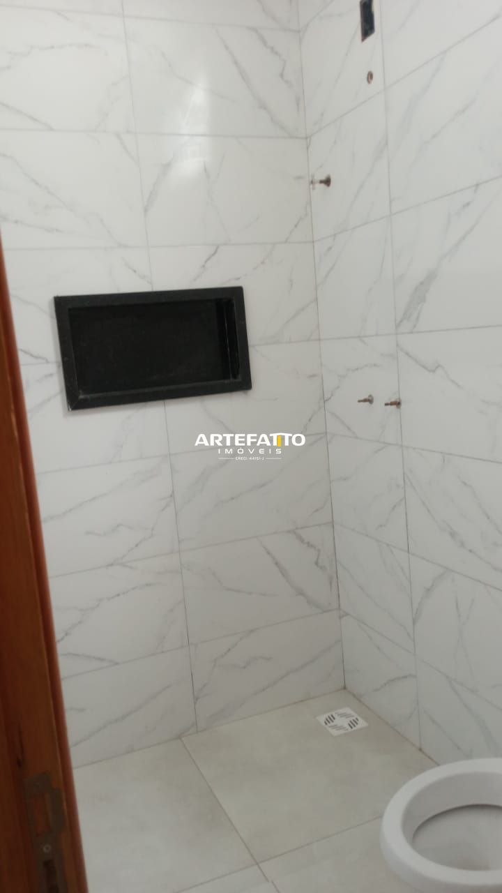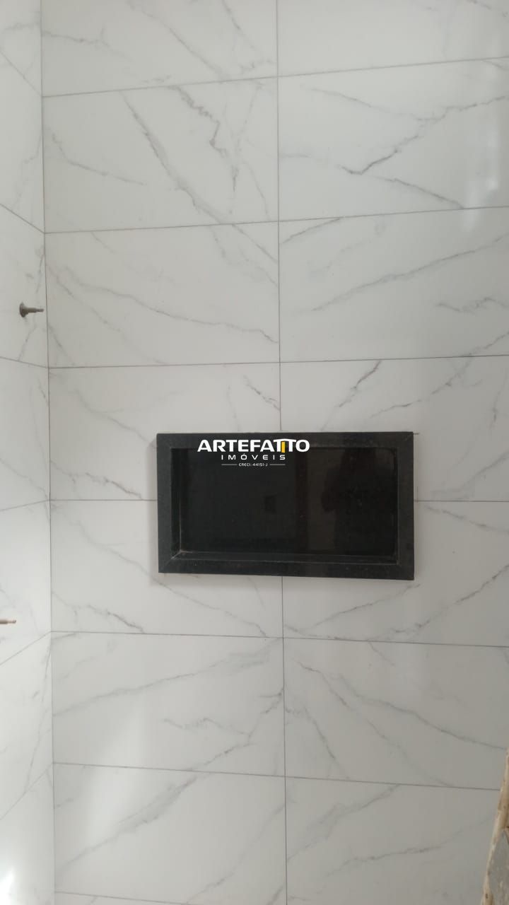 Acabamento com porcelanato, blindex, sanca e pias em pedra São Gabriel.