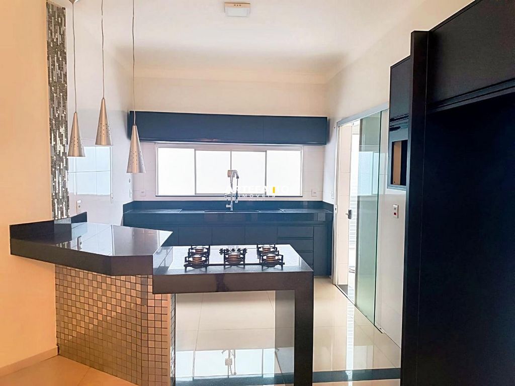 Ambientes todo integrado com sala de tv, cozinha gourmet com ilha e cooktop