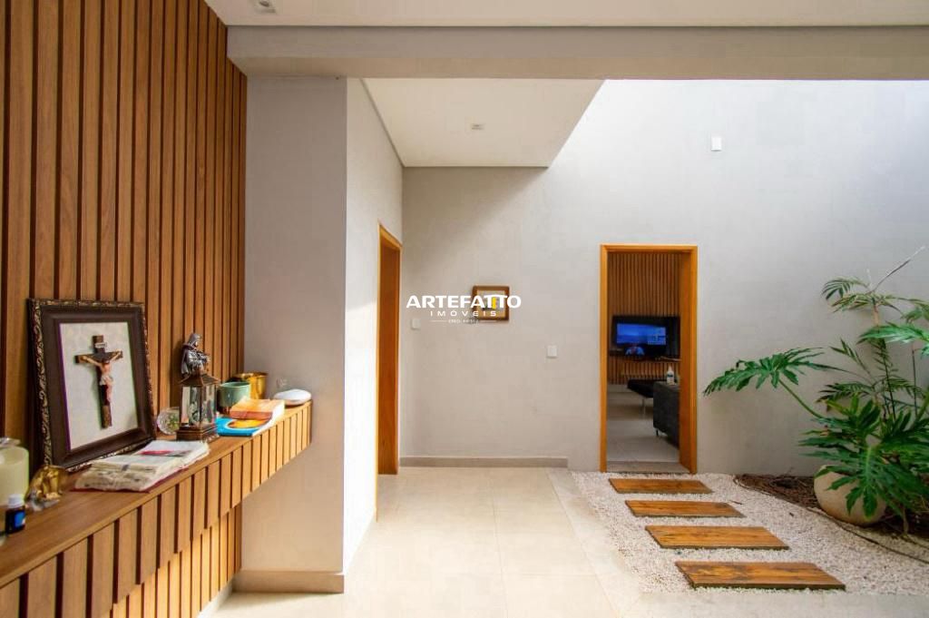 A casa conta com acabamentos de alto padrão, com pisos de porcelanato em toda a área social e suítes, bancadas em granito e mármore, janelas e portas de alumínio, e iluminação de LED em todos os ambientes. Além disso, os detalhes em madeira natural conferem um toque sofisticado e acolhedor ao imóvel.